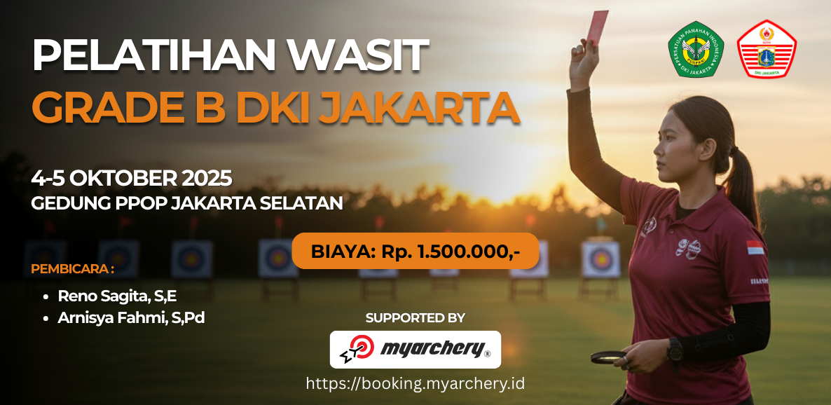Event "Pelatihan Wasit Grade B DKI Jakarta" akan diselenggarakan pada tanggal 4-5 Oktober 2025 di Gedung PPOP Jakarta Selatan. Acara ini dirancang khusus untuk meningkatkan kompetensi dan profesionalisme para wasit dalam bidang olahraga panahan, dengan standar yang lebih tinggi dibandingkan grade sebelumnya. Pelatihan ini menghadirkan pembicara berkualitas seperti Reno Sagita, S.E., dan Arnisa Fahmi, S.Pd., yang memiliki pengalaman luas di dunia olahraga dan pelatihan wasit. Peserta akan mendapatkan kesempatan untuk mempelajari teknik wasit terbaru, aturan kompetisi yang diperbarui, serta strategi pengambilan keputusan di lapangan agar dapat mendukung jalannya pertandingan dengan adil dan profesional.